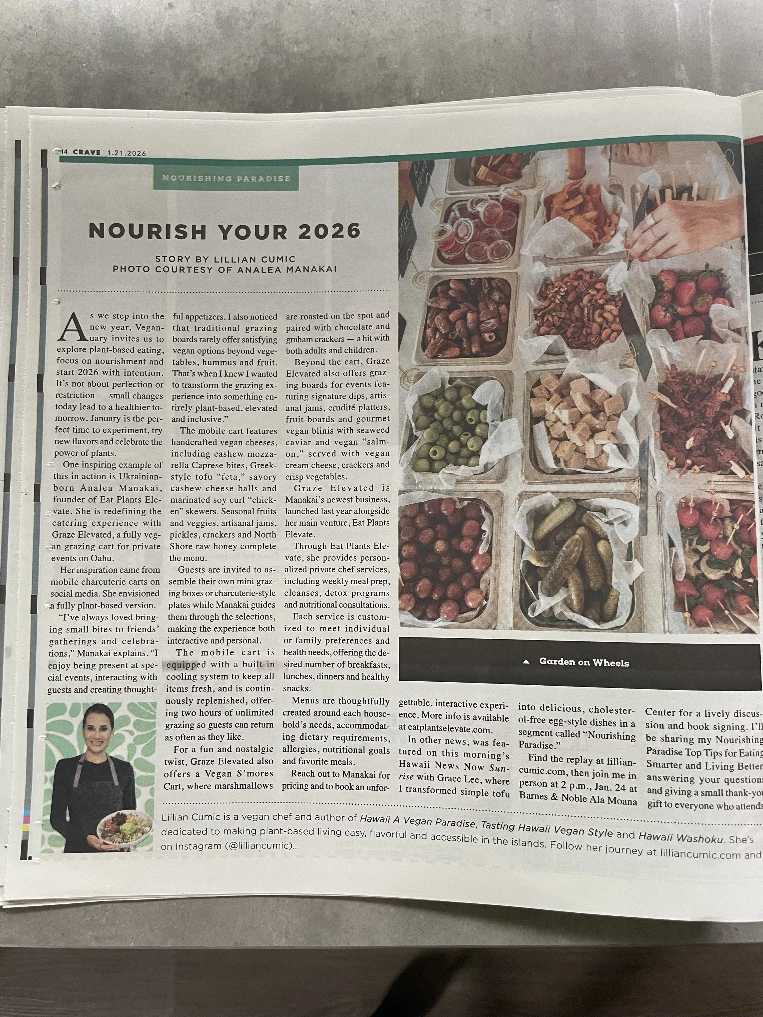 Many thanks to an amazing vegan chef, Lillian Cumic, who wrote an article about my other business, Graze Elevated, in her monthly column Nourishing Paradise.