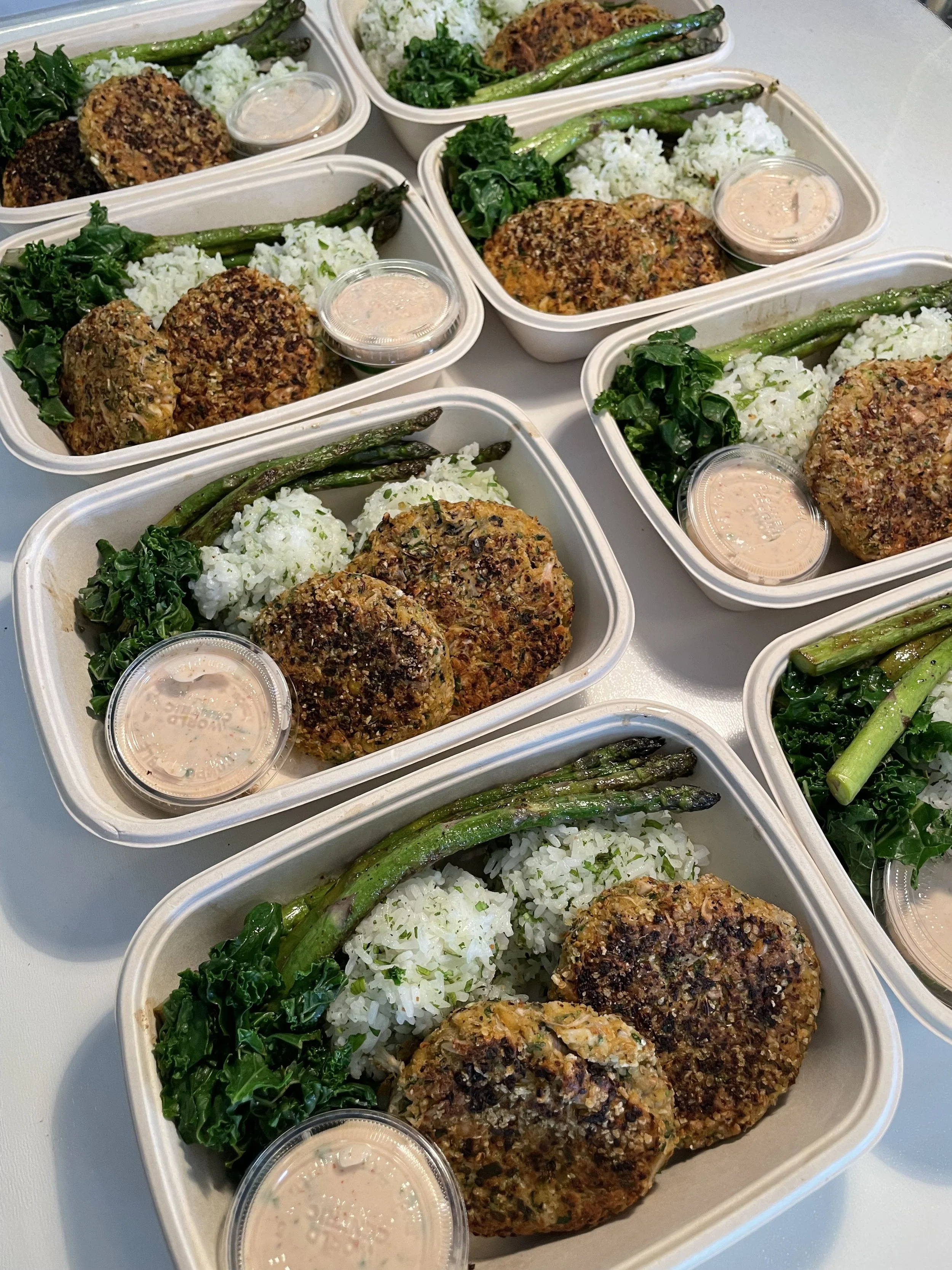 Garbanzo Jackfruit Crabcakes, Grilled Asparagus, Cilantro Rice, Remoulade Sauce