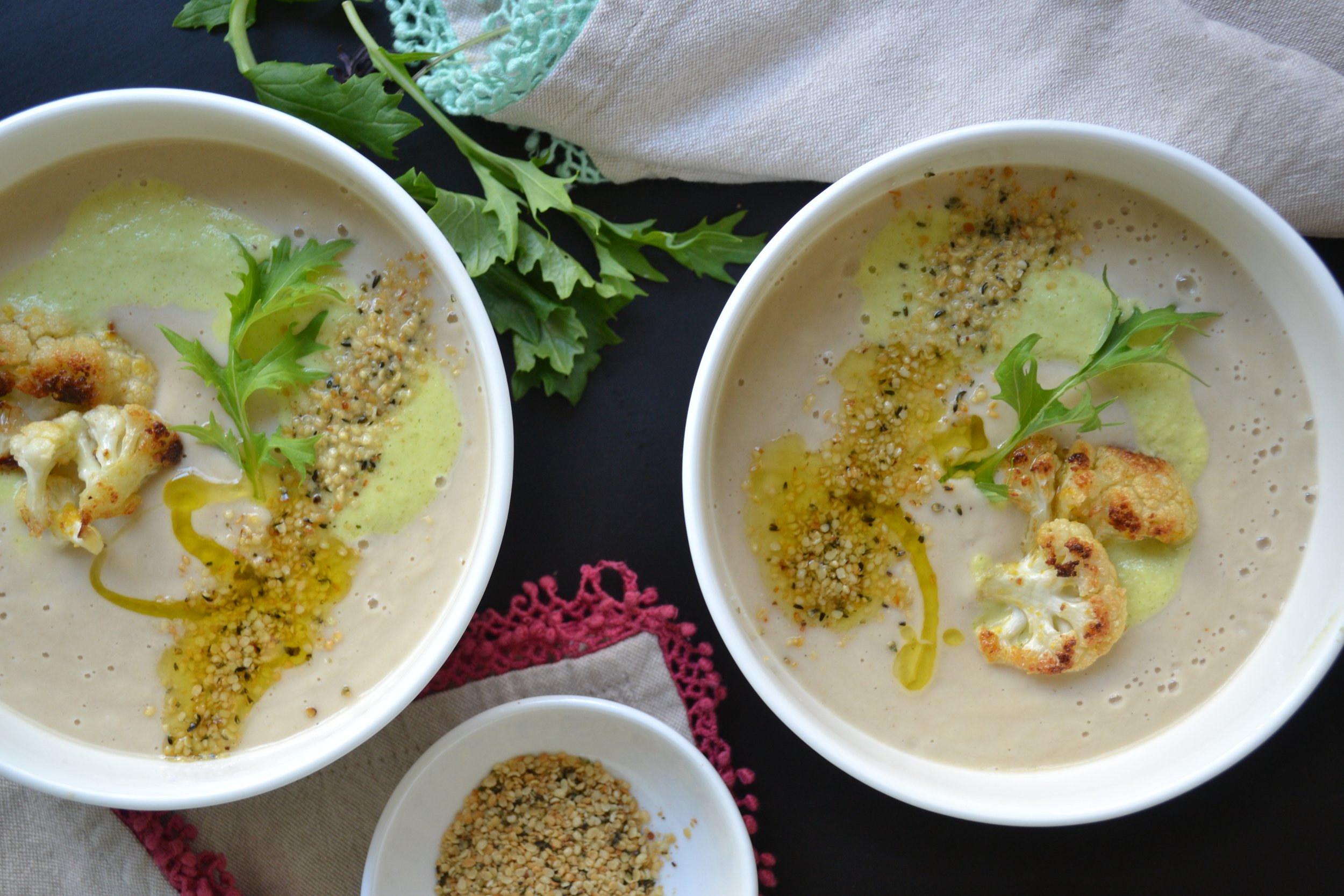 Cauliflower Fennel Soup, Roasted Hemp Seeds, Fennel Sauce
