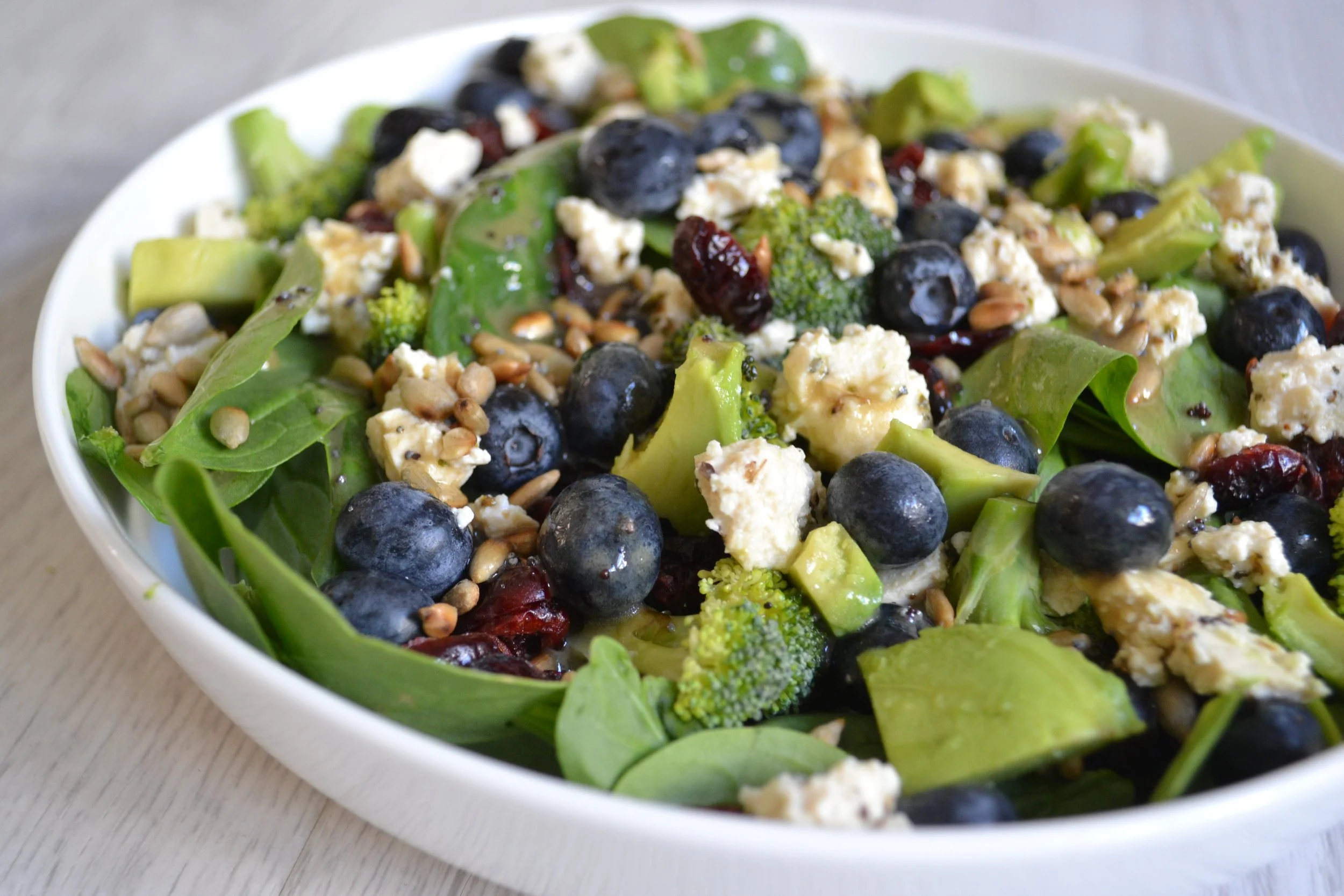 Spinach, Broccoli, Blueberries, Vegan Feta Cheese, Cranberries, Roasted Sunflower Seeds, Mint