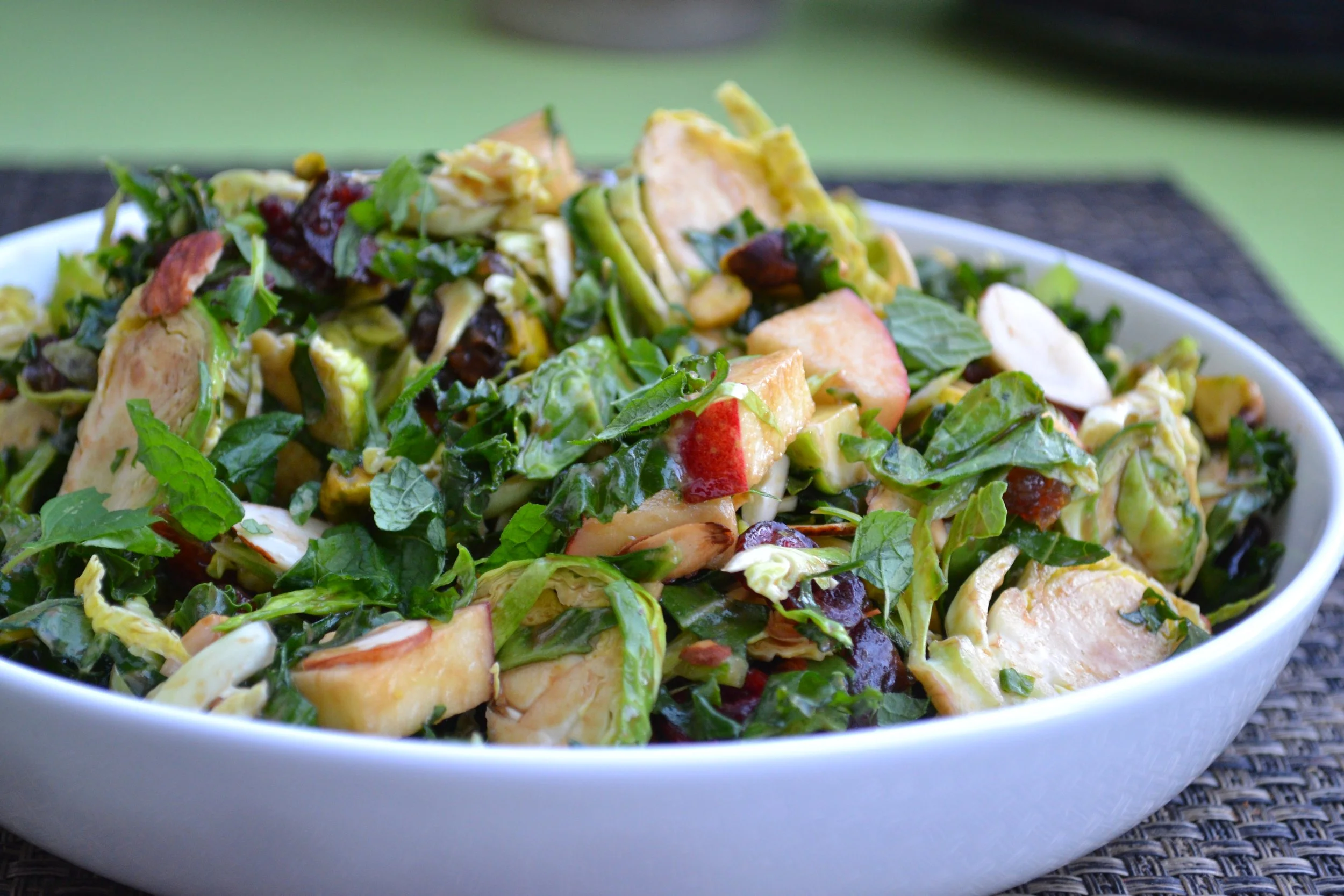 Shredded Brussel Sprouts, Apples, Dates, Sliced Almonds, Balsamic Honey Dressing