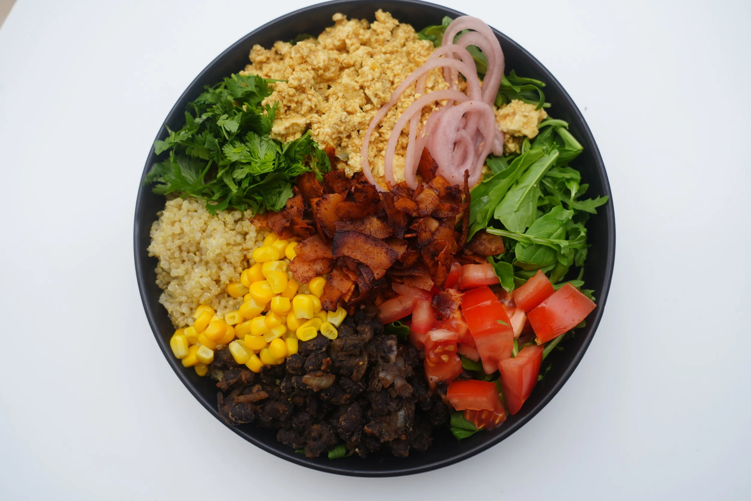 All-Day Breakfast Bowl, Tofu Egg Scramble, Coconut Bacon, Refried Black Beans, Quinoa, Greens, Pickled Red Onions